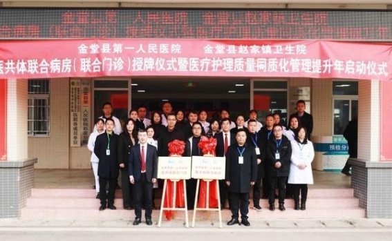 2025-01-09 来源:2025年1月3日,金堂县第一人民医院医共体联合病房(联合门诊)正式揭牌,标志着金堂县医疗服务进入一个新阶段。揭牌仪式暨医疗护理质量同质化管理提升年启动仪式在金堂县赵家镇卫生院举行。金堂县卫健局副局长范忠建,金堂县第一人民医院及赵家镇卫生院的领导和职工代表参加了此次活动。